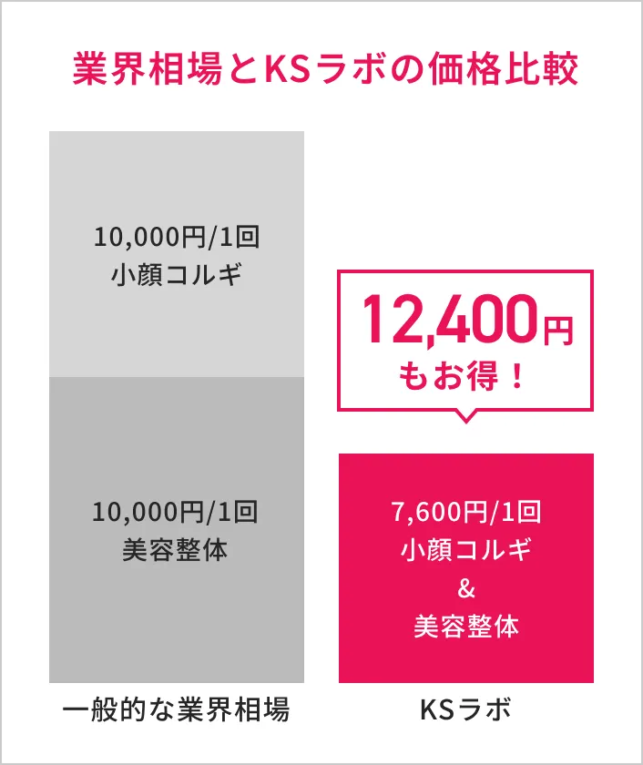 KSラボにメインのメニューが一つしかないのは体と顔の両方の悩みを【小顔整体コルギ】だけで改善できるからです。通常よりひどい状態の部位には小顔矯正、顔の歪み矯正、頭蓋骨矯正、首、肩こり改善、デコルテ矯正、肩甲骨背面矯正のいずれかをつけてアプローチしていきます。
