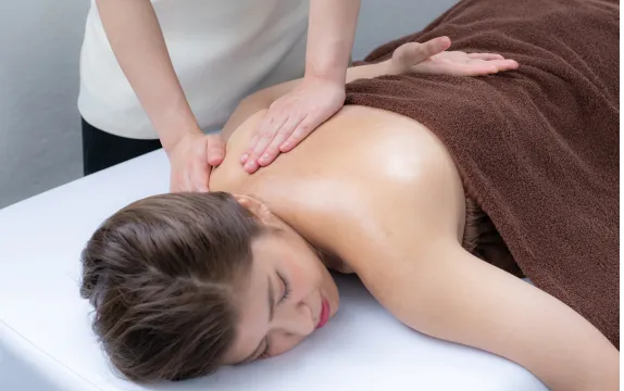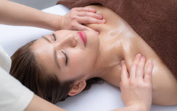 肩甲骨と背骨を調整して姿勢を正します。続いて首回りとデコルテのリンパをしっかり流し、首・肩のコリをほぐします。