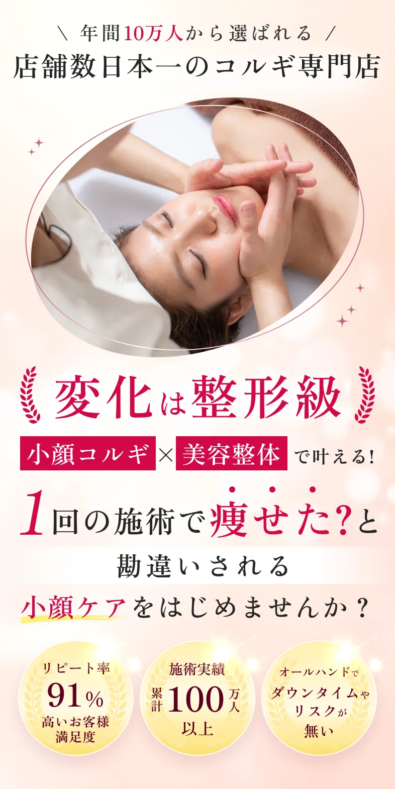 多くのお客様に満足いただきながら今では全国50店舗以上展開し、延べ100万人の施術実績がございます。