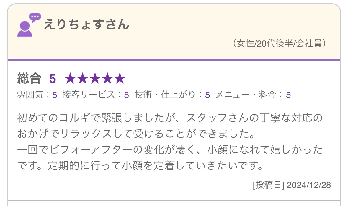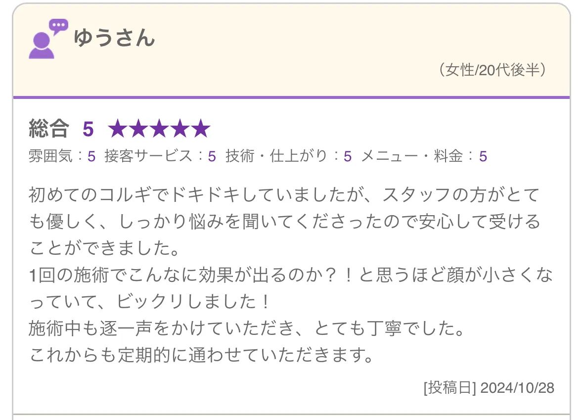 1回の施術でも変化を出すことにこだわった、小顔コルギと美容整体の技術で毎回の施術で変化を実感いただけるので、安心して継続いただくことができます!